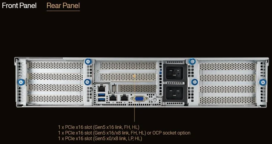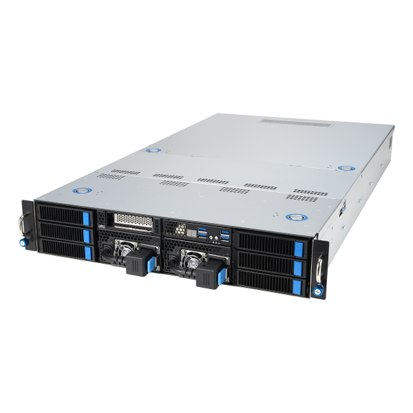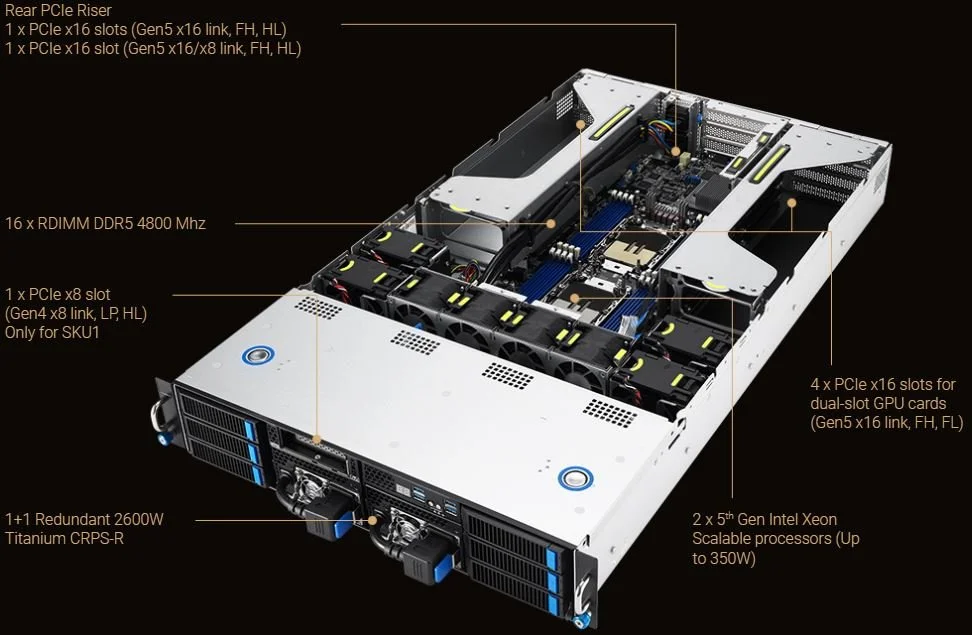 2U dual-socket GPU server powered by 5th Gen Intel Xeon Scalable processors that supports four dual-slot GPUs, liquid cooling solution, 16 DIMM, six NVMe, two 2600W Titanium power supplies and ASUS ASMB11-iKVM