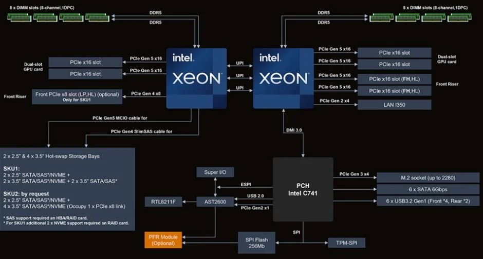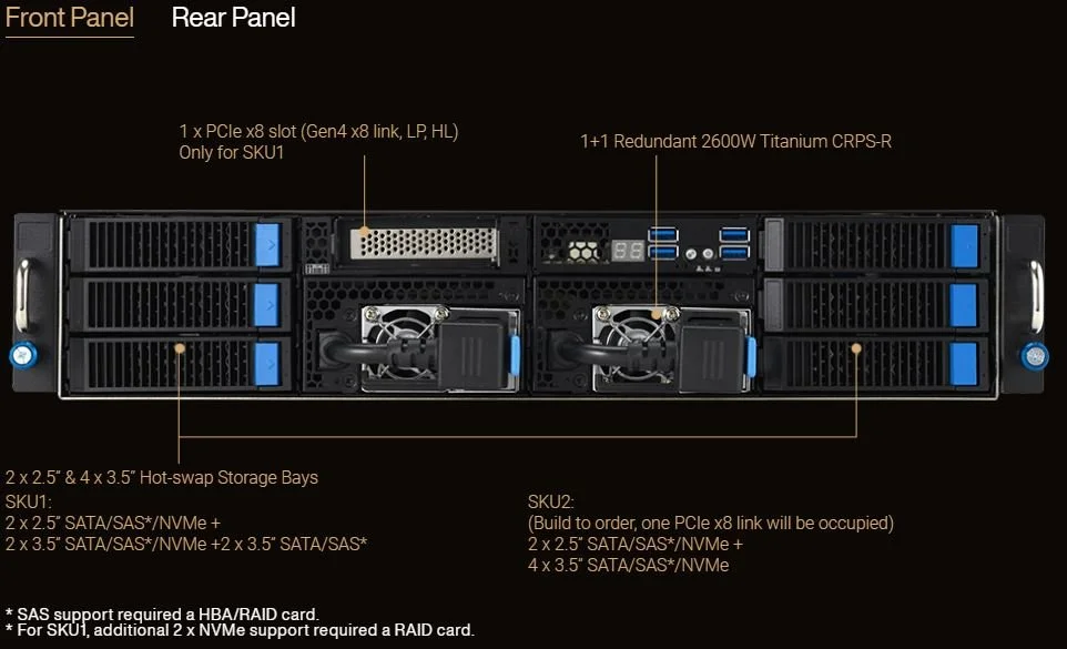 **For SKU1 additional 2 x NVMe support required a RADI card.