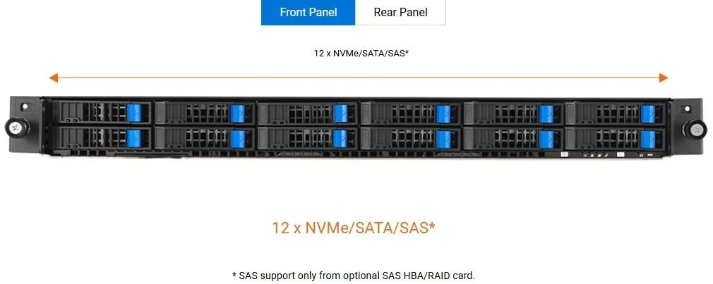 12×2.5” NVMe/SATA/SAS* hot-swap bay (HBA/RAID is required to support SATA/SAS hard drives)